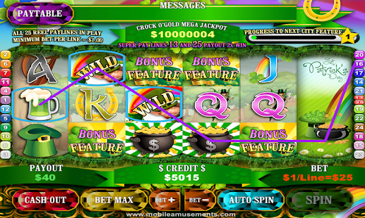 Crock O'Gold Slots the latest lucky 6x3 Irish themed St. Patrick's Day celebration slot machine where you can win a virtual cash fortune! Try to win as much cash as possible by also playing features such as the Leprechaun's Riches Bonus Feature, Lucky Shamrock and Crock O'Gold mini-games to accumulate virtual credit prize bonuses. As you progress you will travel around Ireland and gain even more fantastic prize bonuses and new features. Including extra features such as 2x Payout Reels, Lucky Line, Super Lines, Multi-Free Spins and HUGE Cash Bonuses. Will you celebrate St. Patrick's Day and open the 6th reel for a chance to win the Crock O'Gold Mega progressive Jackpot?