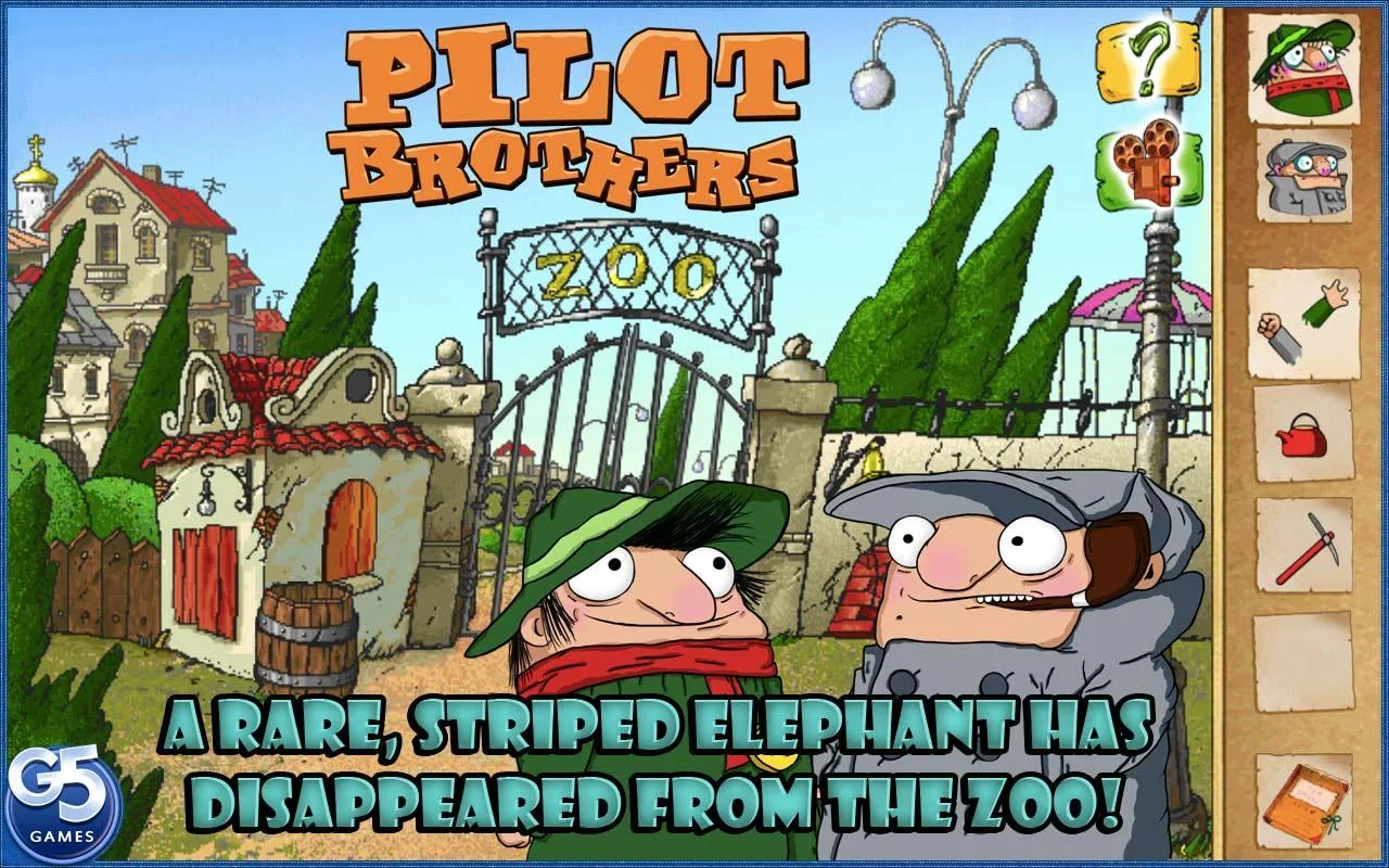 A provincial Russian town has been shaken in disbelief: their prized, rare, striped elephant, Baldakhin, disappeared from the zoo in the dead of night. The main suspect is its notorious former owner, Karbofoss. Two well-known detectives, the Pilot Brothers, set up a new investigation, pursuing the rogue through 15 comic-style locations to find the missing elephant. Sensible Brother Chief and his not-so-bright assistant, Brother Colleague, solve tricky puzzles and play their parts with precise timing in this humorous adventure game for the whole family!