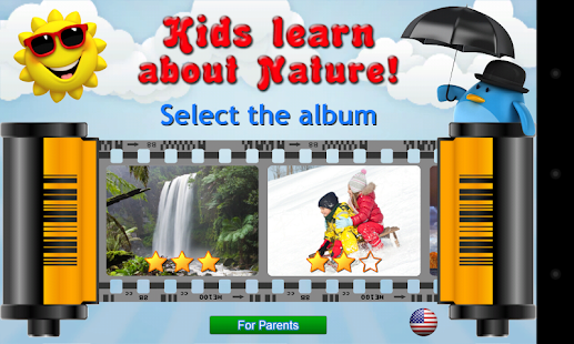 “Nature for Kids,” from the series “Words for Kids,” is a game that promotes the development of children between 2 and 4 years of age. Together with your child, you can watch wonderful images of natural objects and phenomena, seasons, fruits and vegetables, berries, flowers, and mushrooms, all while learning their names! The carefully selected photographs will not only help a child learn the names of various natural objects and phenomena, but also expose him or her to the remarkable beauty of the world in which we live! After the child has looked through all the flashcards, he or she can take a fun quiz to see how many of the words he or she knows. Regardless of the number of correct answers given, and of stars earned, the child's developing skills will be fostered by enthusiastic applause and floating balloons! The educational flashcards for tots are divided into the following categories: berries, fruits, vegetables, flowers, mushrooms, the environment (sea, island, forest, river, mountain, etc.), the seasons, and natural phenomena (rain, rainbow, sunset, lightning, etc.). One important feature makes this educational app stand out from the rest: instead of drawings, which are not always easy to identify, the child will see beautiful, colorful photographs of each object and phenomenon. Clearly, it is not so easy to show real live lightning, rainbow or erupting volcano to a child. This educational app allows the child to “see” many natural objects and phenomena as they appear in reality, while allowing parents to tell the child more about them.